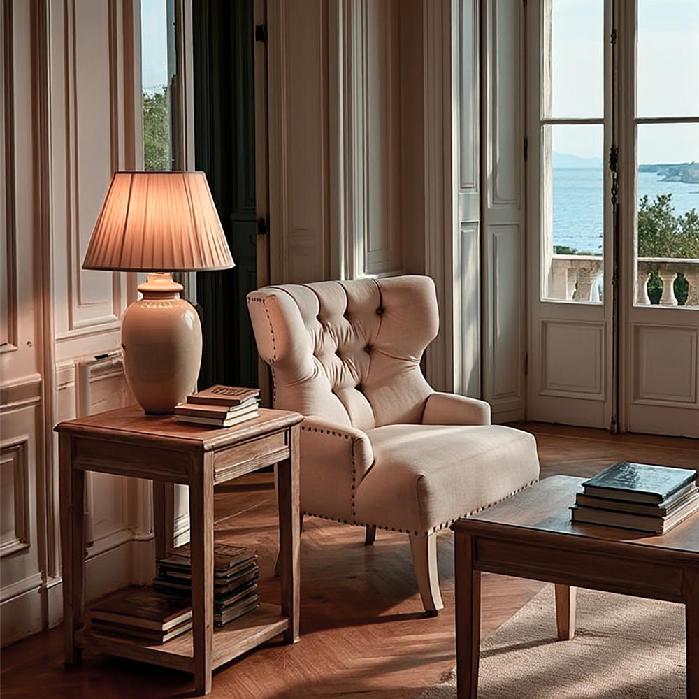 El respaldo está adornado con un hermoso capitoné que le da un toque de sofisticación, mientras que la estructura en forma de orejas te permiten descansar cómodamente mientras disfrutas de tu libro favorito o de una buena película.