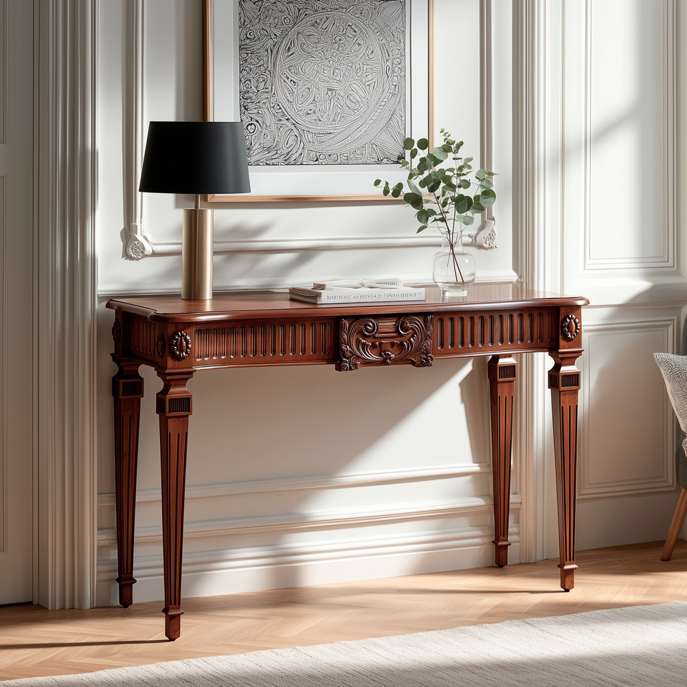 Esta consola de estilo clásico colonial, presenta detalles tallados a mano que la convierten en una pieza única y exclusiva. La madera de caoba maciza utilizada en su construcción, le confiere una gran calidad y resistencia, asegurando su durabilidad a lo largo del tiempo.