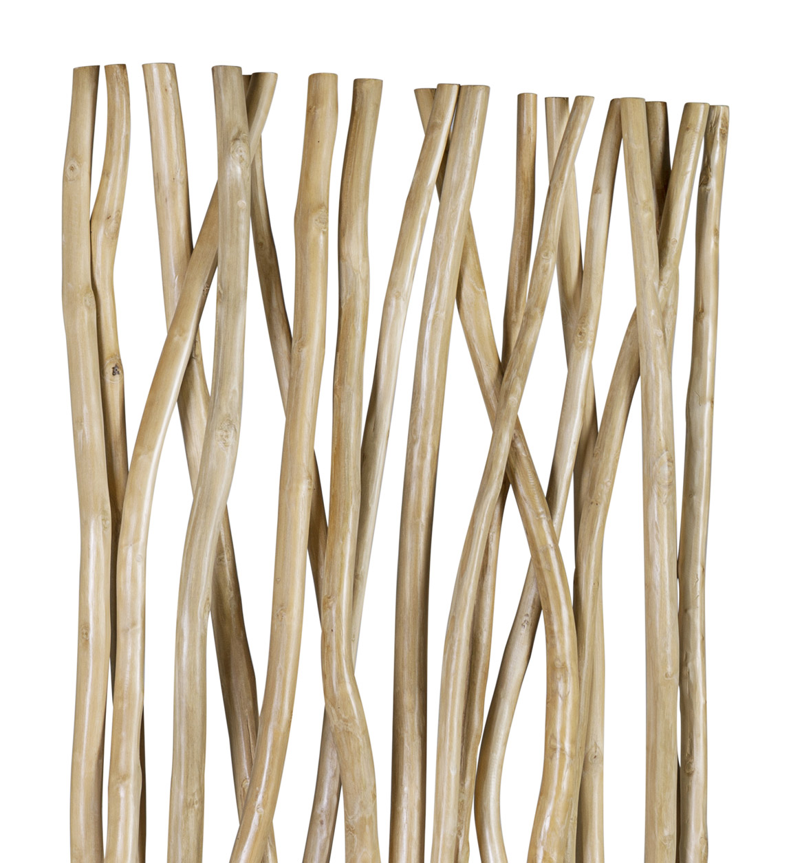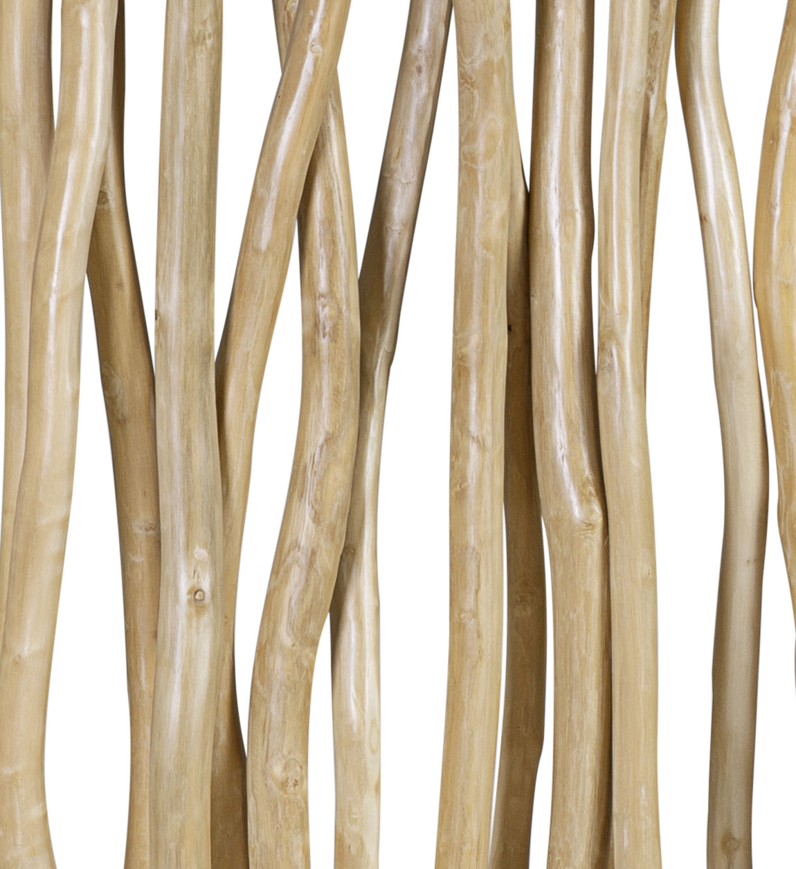 Transforma tu espacio con la belleza orgánica de este biombo de ramas naturales blanqueadas, elaborado a mano en madera de teca maciza. Su diseño vertical, compuesto por ramas auténticas montadas sobre una base robusta, crea una separación visual ligera pero impactante, ideal para dividir ambientes con estilo.