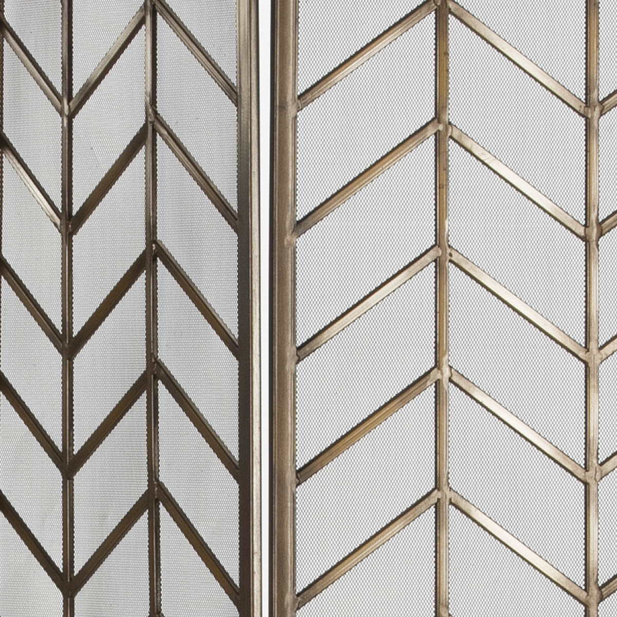 Aporta un aire sofisticado e industrial a tu hogar con este biombo de hierro dorado envejecido, una pieza funcional y decorativa que destaca por su estructura sólida y su elegante diseño geométrico. La rejilla metálica perforada crea una sensación de ligereza visual, permitiendo el paso de la luz sin perder privacidad.