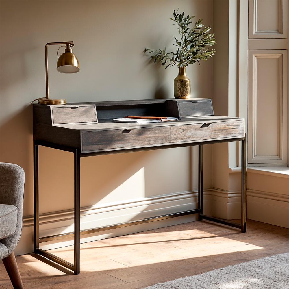 Prepárate para mejorar tu espacio de trabajo con el escritorio Aracaju : el equilibrio perfecto entre un estilo étnico moderno y un aspecto clásico atemporal. Con nuestro acabado lleno de personalidad New Dark Ivory e inspirado en la herencia cultural de África Occidental, cada pieza está hecha a mano con madera de mindi y metal acabado en color latón oscuro. Disfruta de la comodidad de un espacio de trabajo que saca lo mejor de ti.
