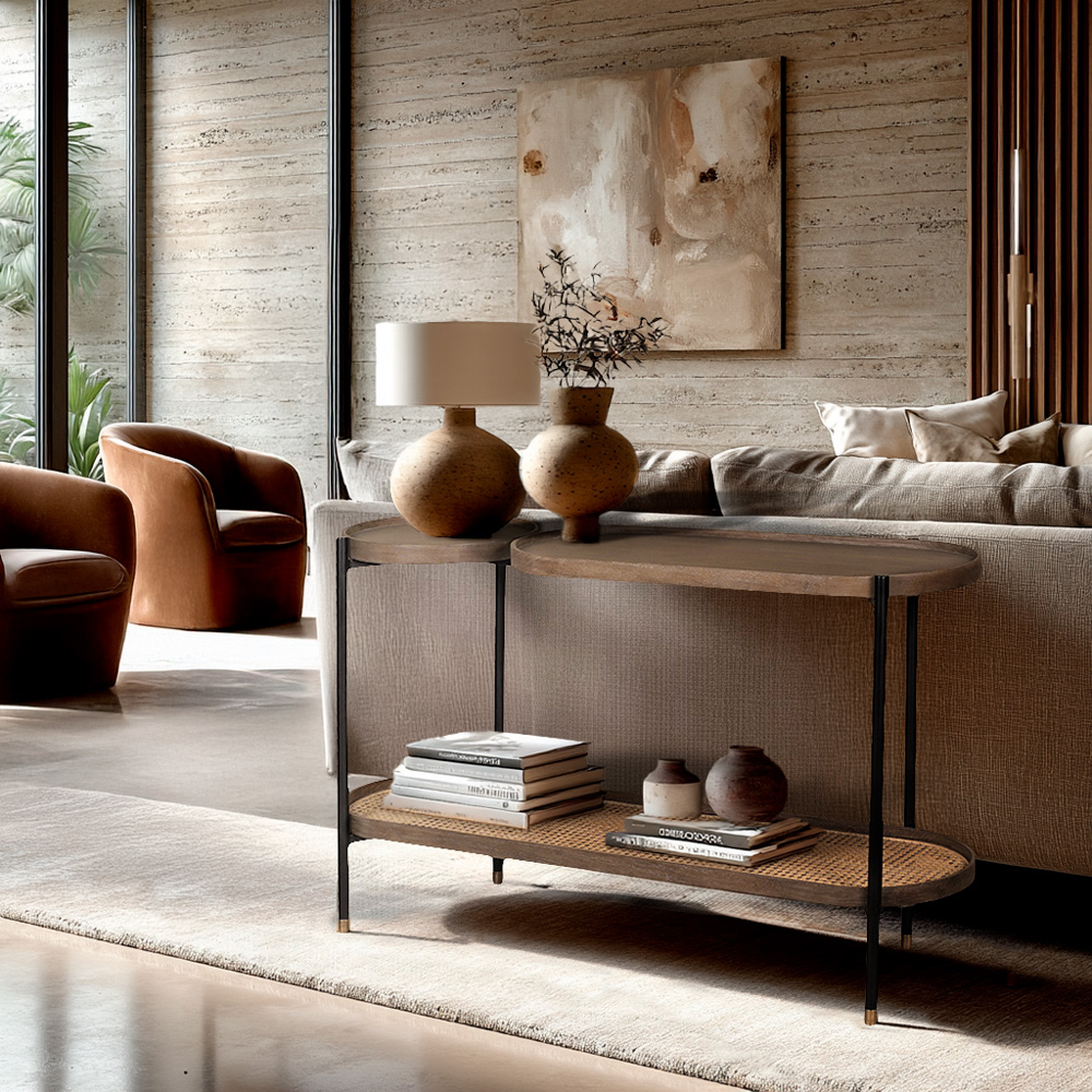 Descubre la Consola Amba, una pieza única y elegante que añade un toque distintivo a tu espacio. Fabricada a mano en madera de mindi con patas metálicas acabadas en negro, esta consola fusiona la artesanía con un diseño moderno. Su estante en rattan y madera agrega un toque natural y sofisticado, creando un equilibrio perfecto entre lo clásico y lo contemporáneo. Cada detalle ha sido cuidadosamente elaborado, ofreciendo una pieza duradera y llena de estilo para tu hogar.