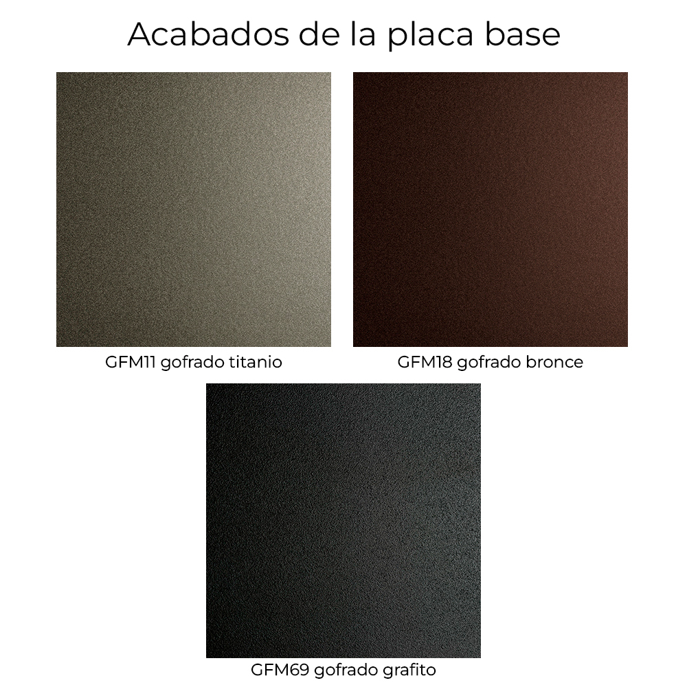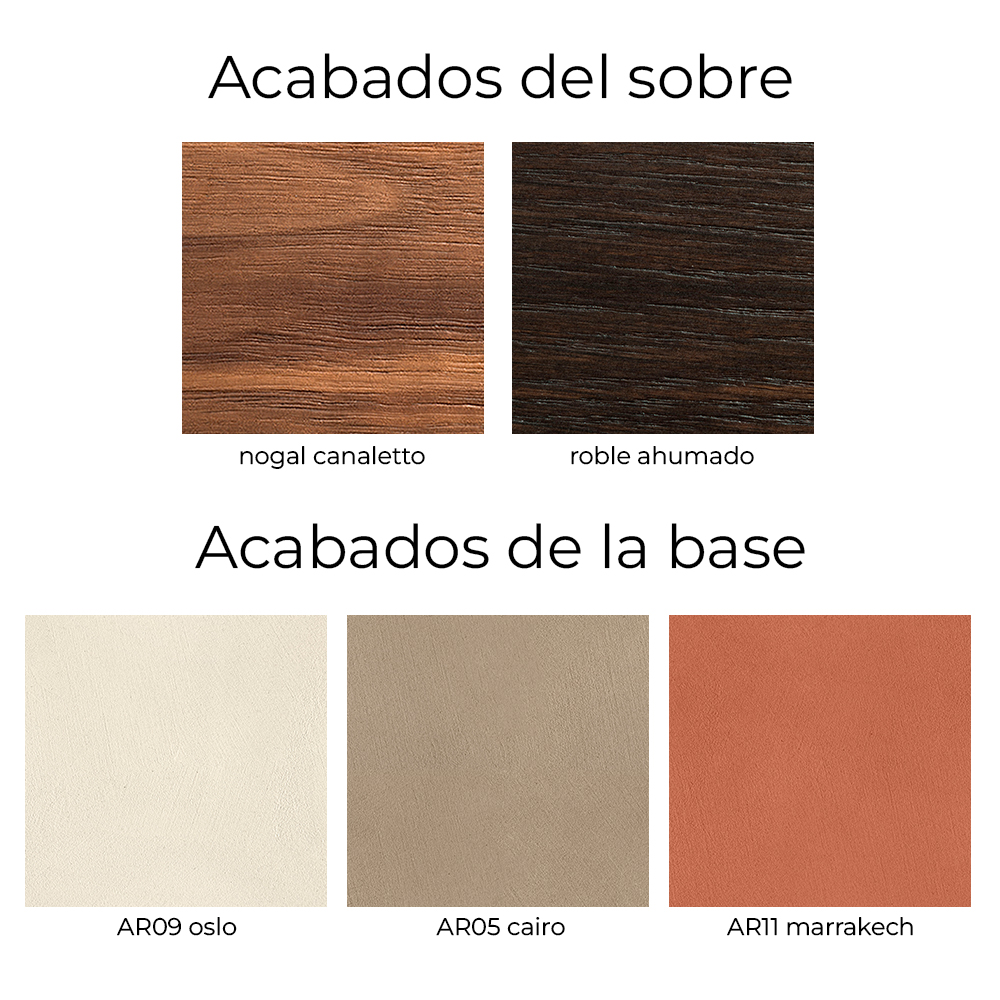 Mesa con base en polímero modelado a espátula con acabado en arcilla, disponible en tres tonalidades: Cairo (AR05), Oslo (AR09) o Marrakech (AR11). Placa de base en metal barnizado gofrado titanio (GFM11), bronce (GFM18) o negro (GFM73).