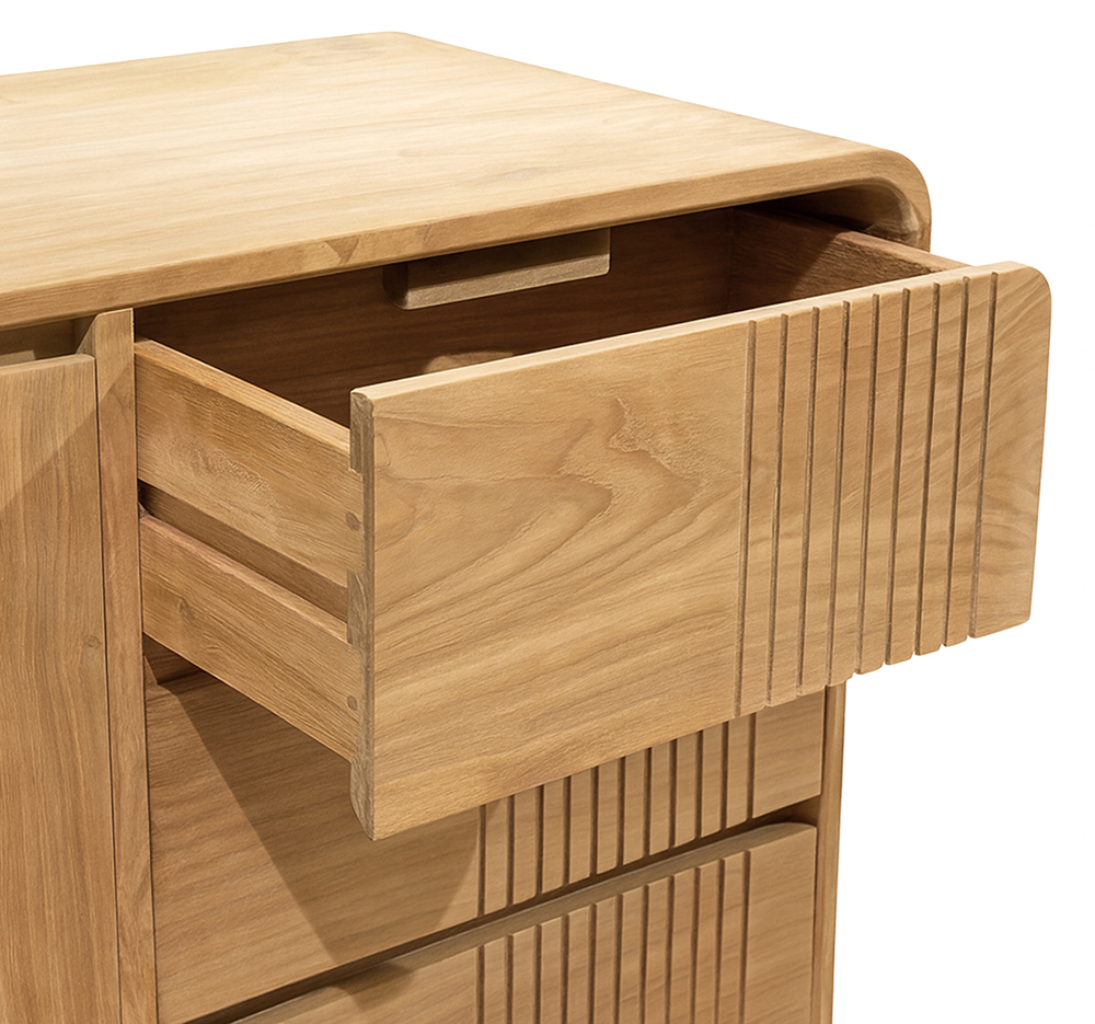 Aparador de 3 puertas y 3 cajones en madera de teca natural, modelo Eyre. Ofrece amplio espacio de almacenamiento con un diseño sobrio y equilibrado. Perfecto para comedores o salones que buscan funcionalidad con estilo. La textura y tono de la teca aportan autenticidad y calidez.