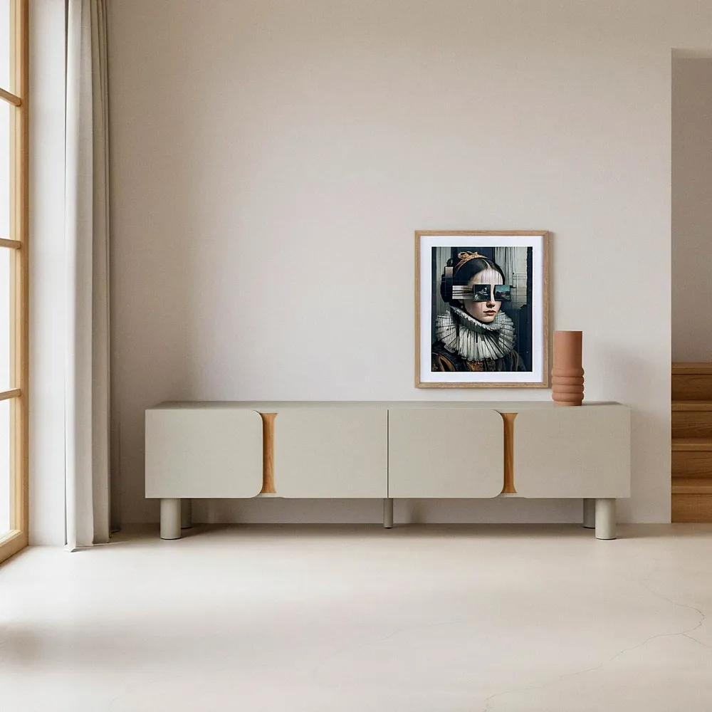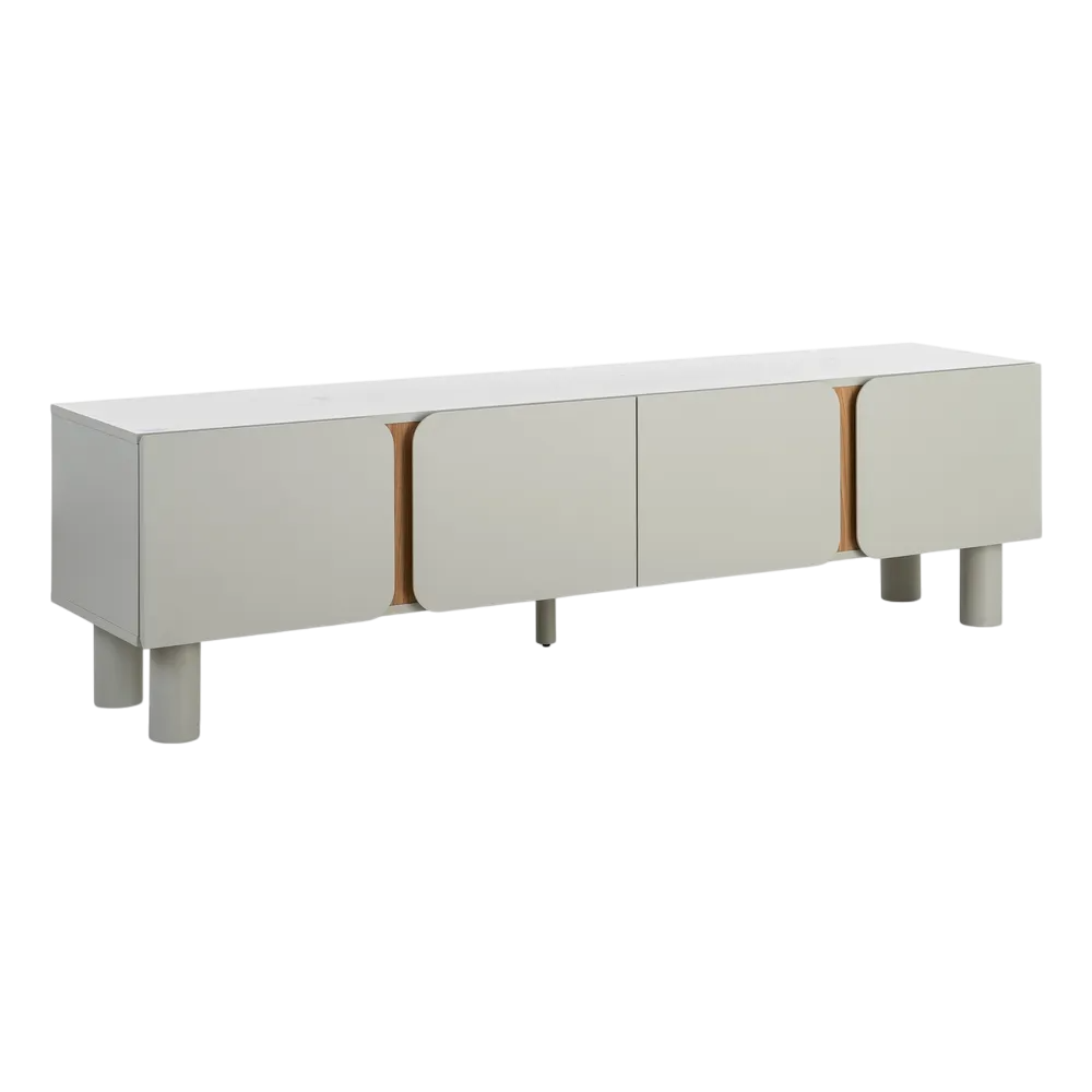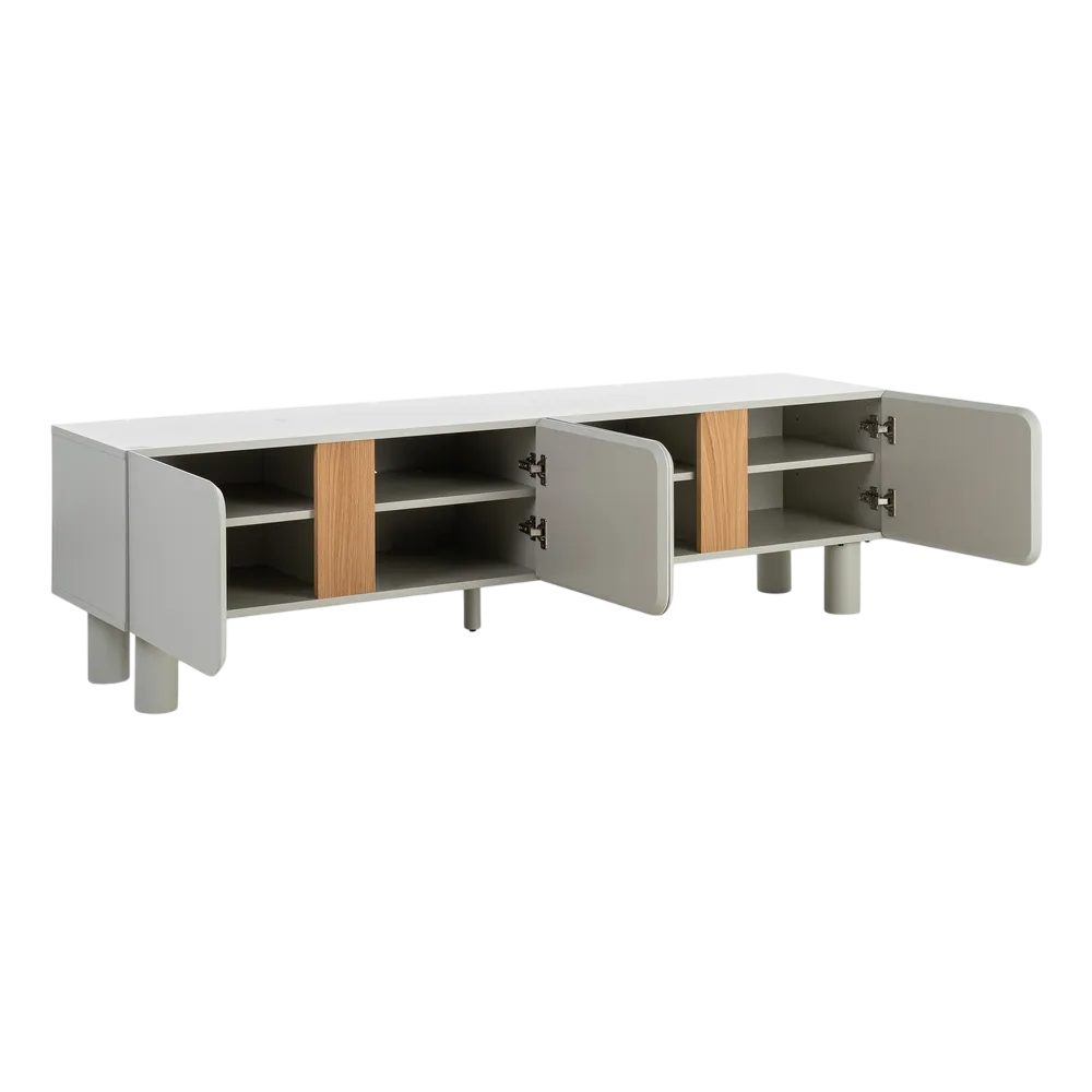 El mueble cuenta con cuatro puertas, cada una de ellas con dimensiones de 43 x 33,5 cm. Estas puertas son perfectas para ocultar los cables y otros objetos, manteniendo un aspecto ordenado y organizado. El diseño de las puertas, con formas redondeadas, agrega un toque contemporáneo y distintivo al mueble, haciéndolo visualmente atractivo.