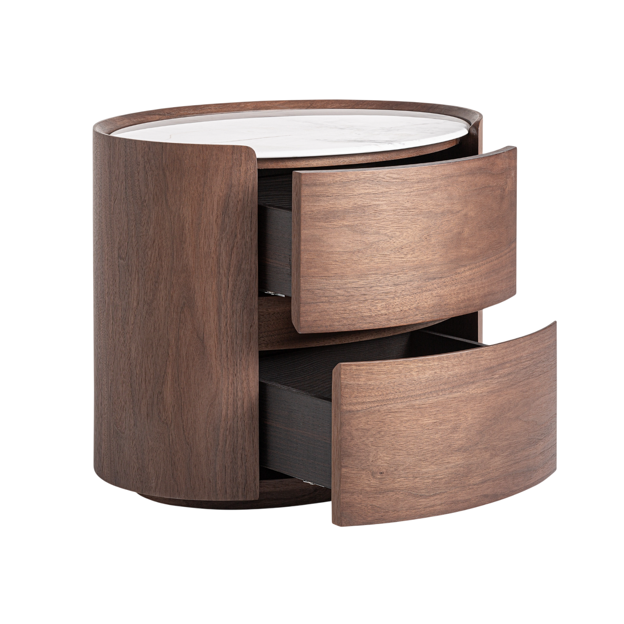 El diseño de la mesita es compacto y orgánico, con líneas suaves y formas redondeadas que crean un equilibrio visual. Las dos cajoneras frontales, de apertura curva, son un detalle distintivo que añade un toque moderno y estilizado. Estos cajones, además de facilitar el acceso a tus objetos personales, proporcionan un espacio de almacenamiento adicional, manteniendo tu habitación organizada y libre de desorden.