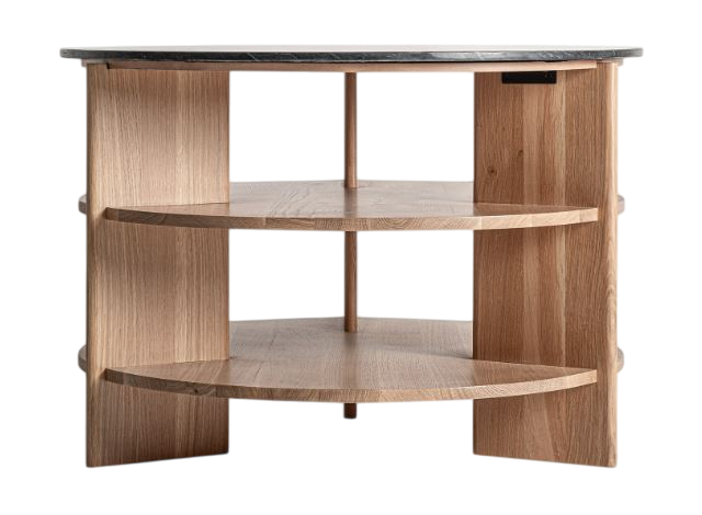 La mesa auxiliar cuenta con dos niveles adicionales, que brindan un espacio adicional para almacenamiento o para exhibir objetos decorativos, libros o revistas. Estos estantes abiertos no solo incrementan su funcionalidad, sino que también permiten que la luz fluya, manteniendo una sensación de ligereza en el diseño.