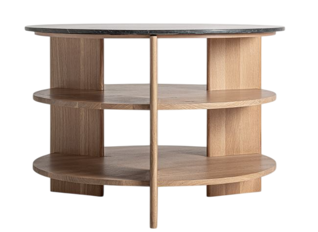 Mesa auxiliar redonda Nara roble natural y travertino negro de lujo