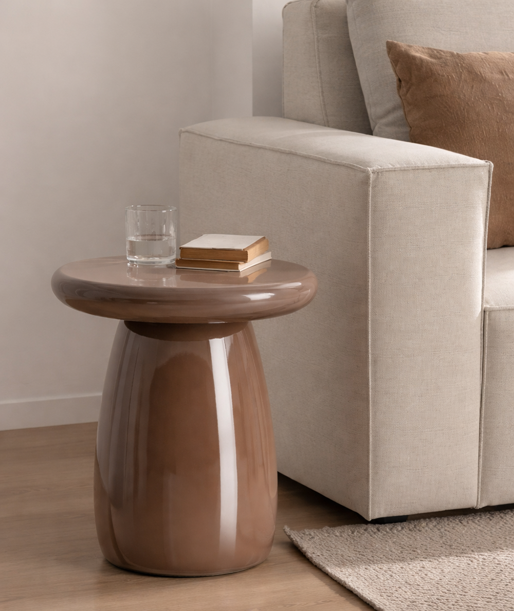 Su forma escultórica es una de sus principales características, destacándose por líneas redondeadas que aportan una sensación de fluidez y armonía. El acabado brillante en color marrón no solo resalta la calidez del tono, sino que también aporta un aire moderno y sofisticado, haciendo que la mesa brille y capte la atención sin ser abrumadora.