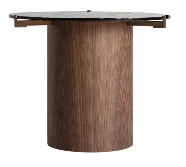 Su estructura está fabricada en nogal laminado de un rico tono marrón, que no solo realza su resistencia, sino que también aporta una sensación de conexión con la naturaleza. La base cilíndrica de la mesa proporciona estabilidad y un perfil elegante, convirtiéndola en un punto focal atractivo para cualquier rincón.