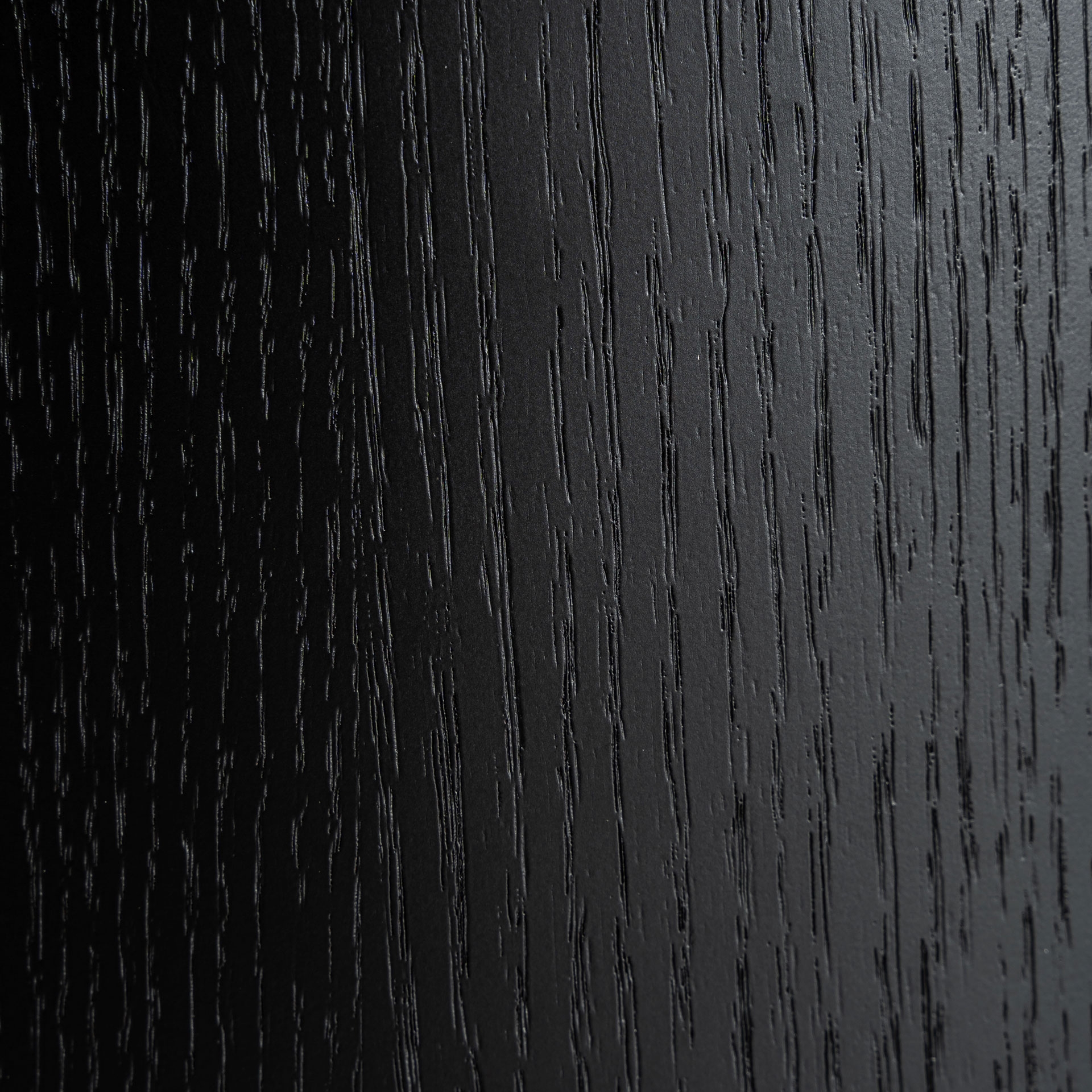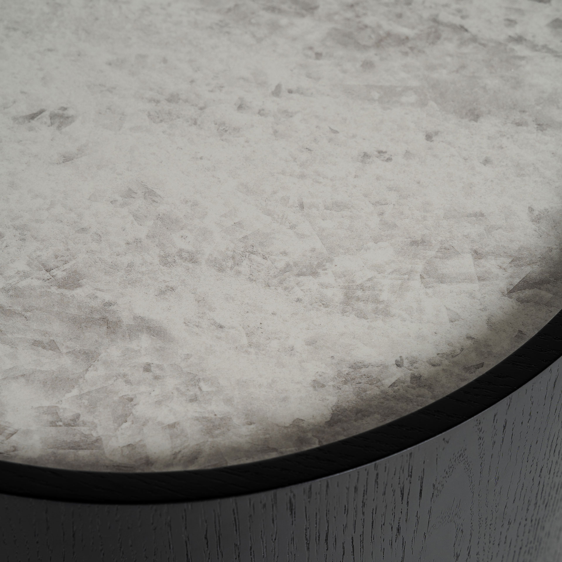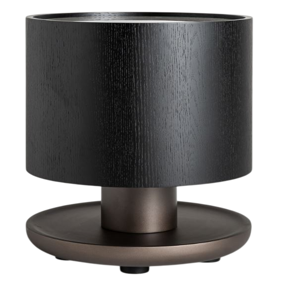 Su estructura, elaborada en roble negro, aporta una sensación de solidez y sofisticación. El acabado en negro de la madera resalta la belleza natural de las vetas del roble, creando un diseño que es a la vez moderno y acogedor. La forma cilíndrica de la base proporciona estabilidad y un aspecto elegante, mientras que la parte inferior en un tono más claro añade un sutil contraste que complementa el diseño general.