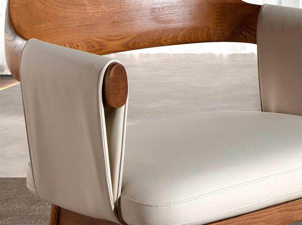 Silla de comedor con reposabrazos, respaldo de madera y asiento tapizado en polipiel crema