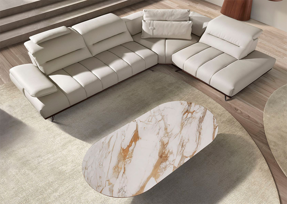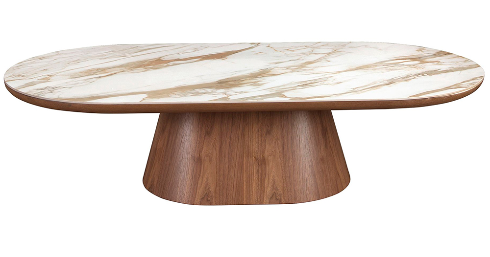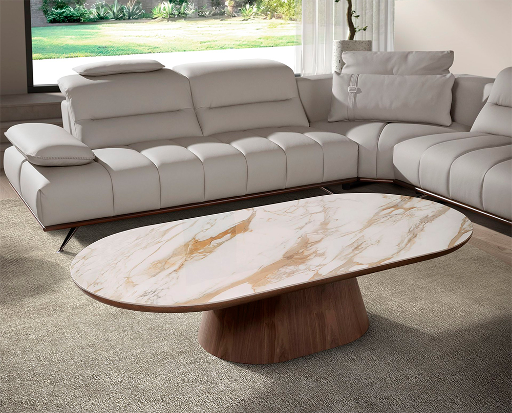 Mesa de centro ovalada medio punto con tapa de mármol porcelánico blanco y patas de nogal