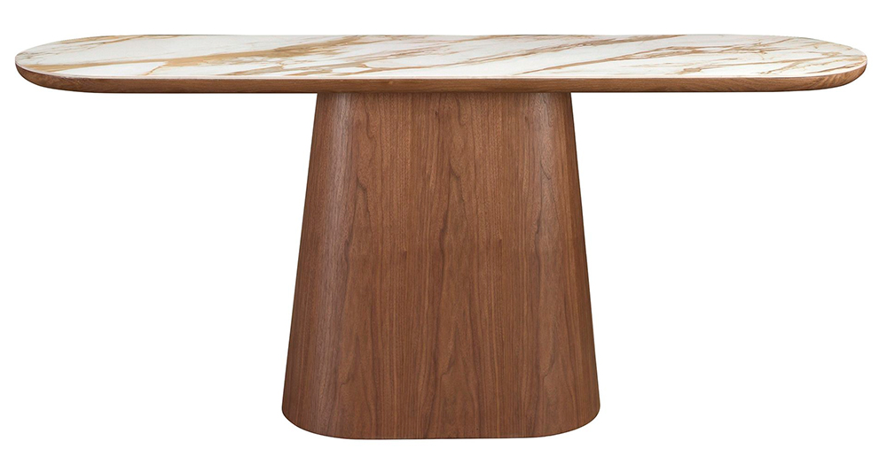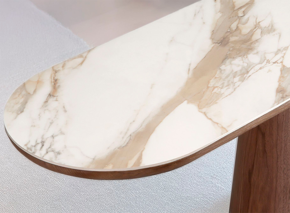 Consola ovalada medio punto de diseño moderno con tapa de mármol porcelánico y patas de nogal