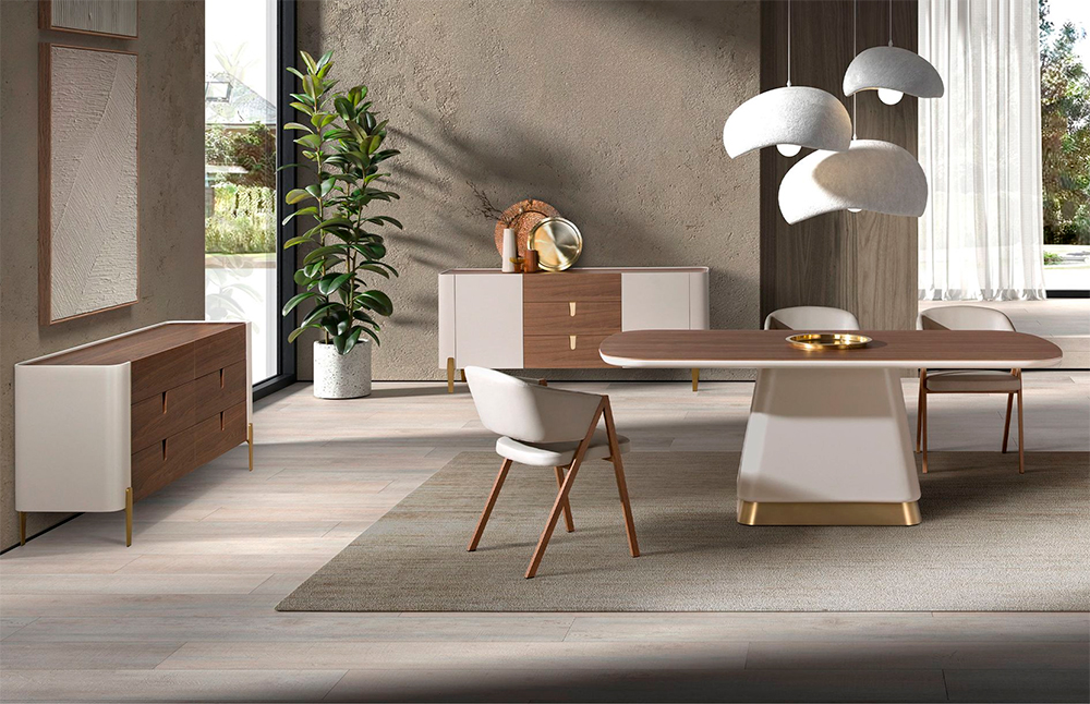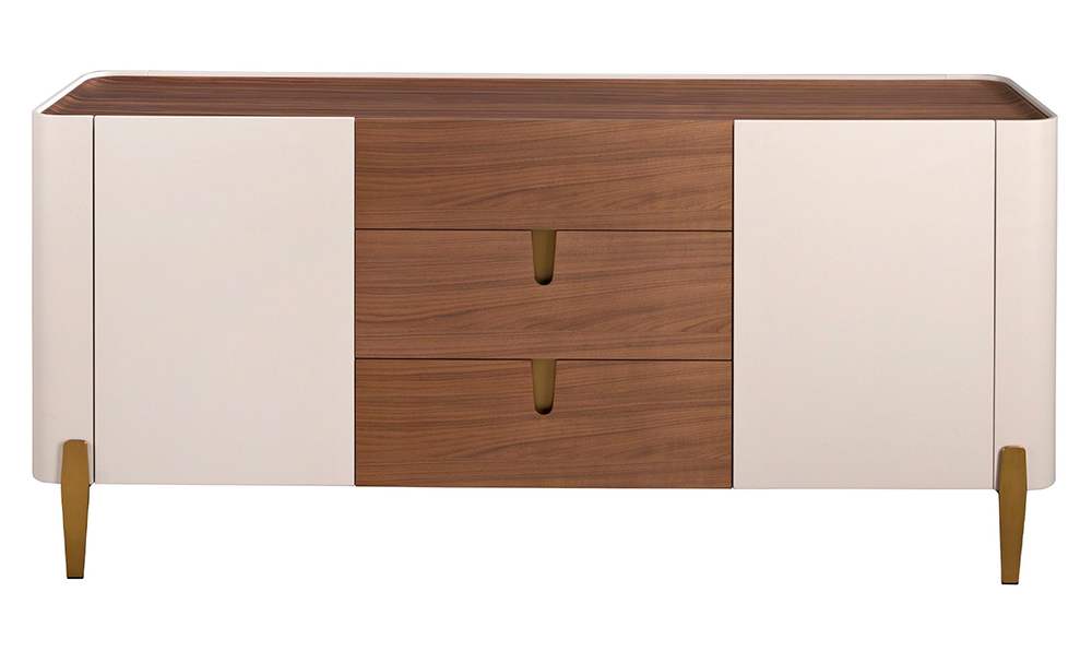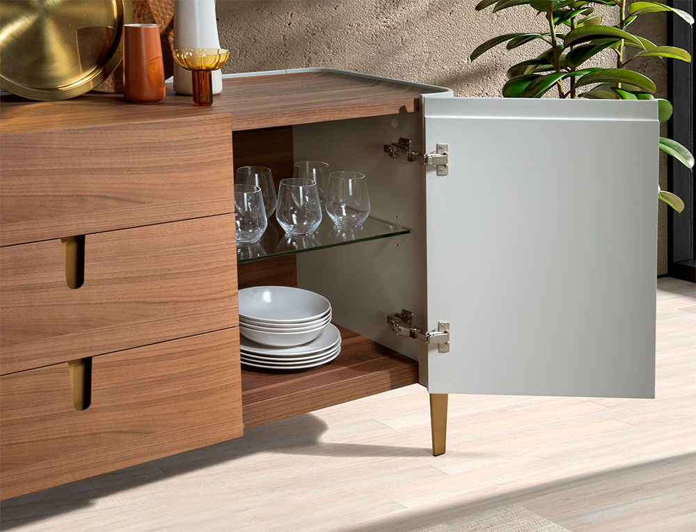 Aparador moderno de madera chapada en nogal y beige con detalles dorados y sistema soft-closing