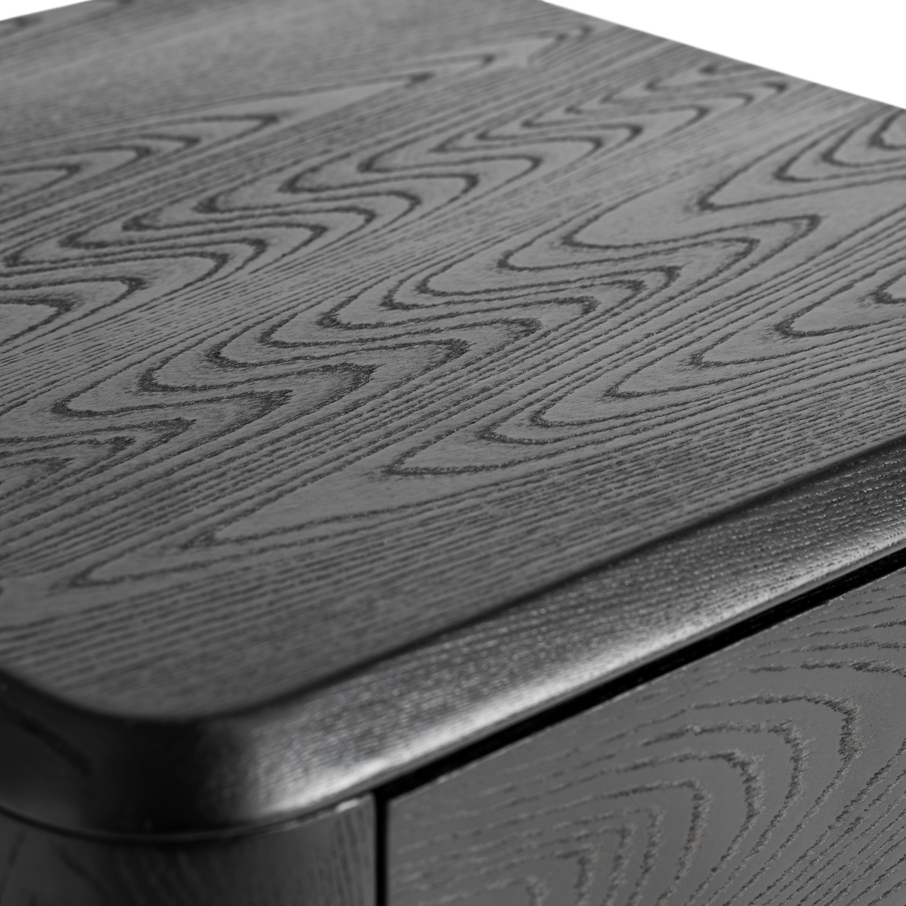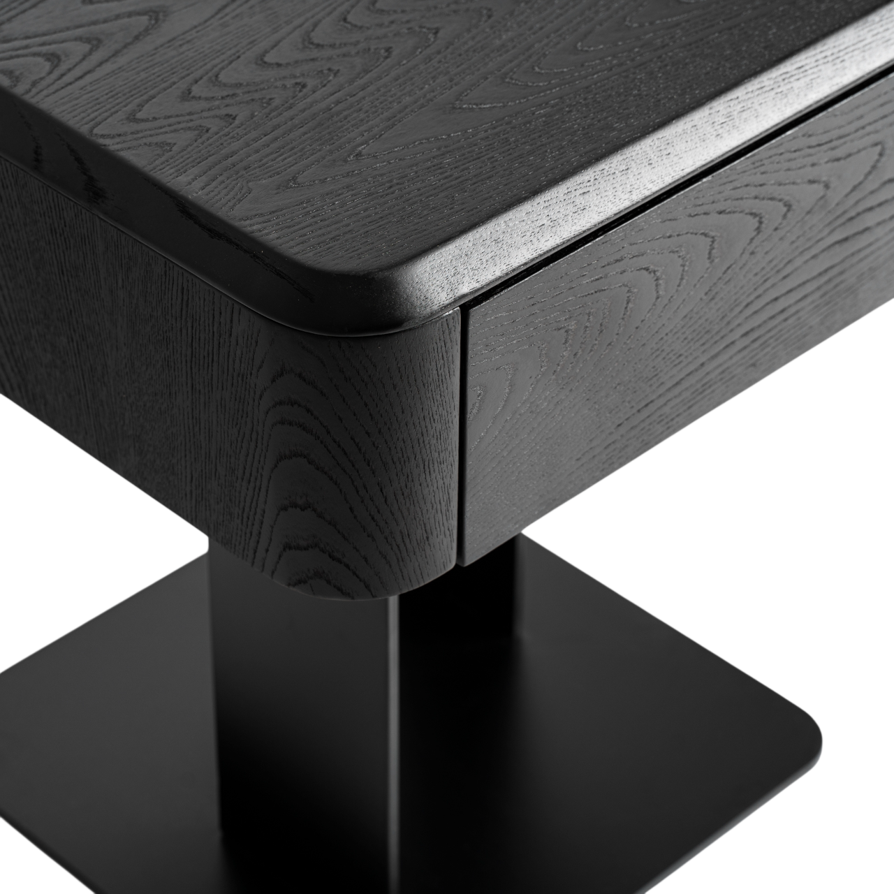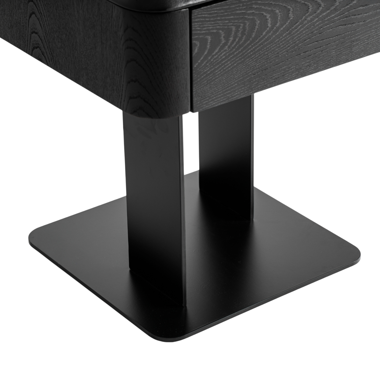 Esta mesa de noche presenta un diseño contemporáneo y funcional, ideal para cualquier dormitorio moderno. Fabricada en Madera DM y olmo, ambos en un elegante color negro, y con detalles en hierro también en negro, ofrece una estética uniforme y sofisticada.